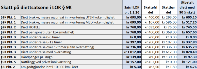 Hvor stor del av dietten som blir skattbar er avhengig av hvilken type innlosjering man har, og om man har kokemuligheter eller ikke. I tabellen under ser man hvordan satsene er på de forskjellige typene, og hva man faktisk får utbetalt hvis man betaler 30 % skatt.